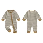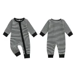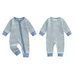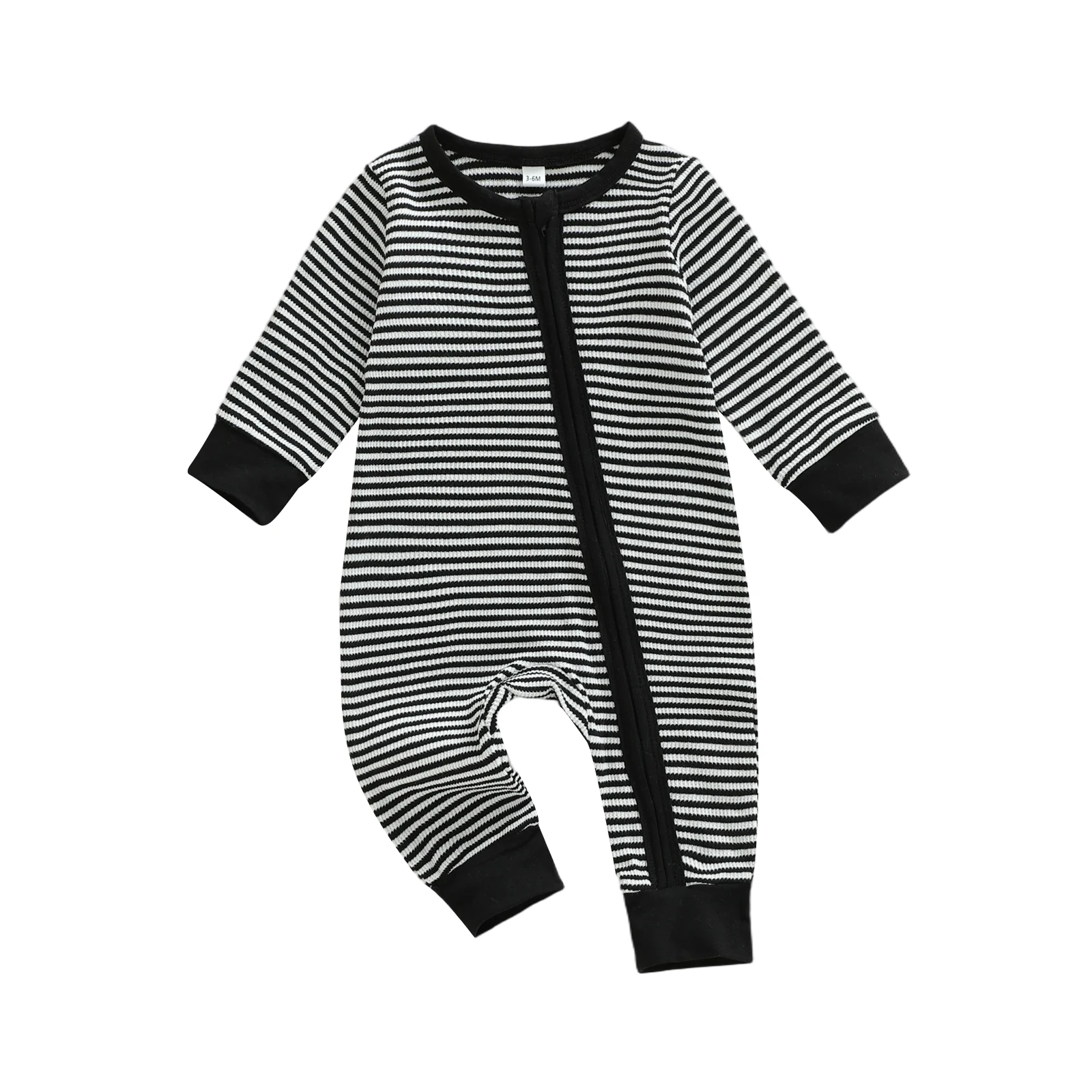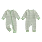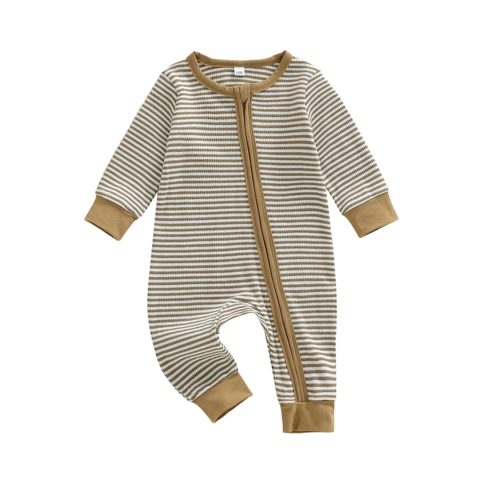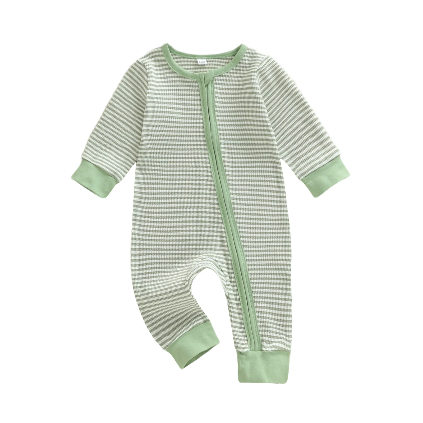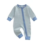 Dress your baby boy in comfort and style with this striped long-sleeve zip-up romper. Made from soft, breathable fabric, it keeps your little one cozy all day while allowing easy movement. The convenient front zipper makes diaper changes quick and hassle-free, while the playful stripe design adds a cute, classic touch. Perfect for everyday wear, naps, or outings.